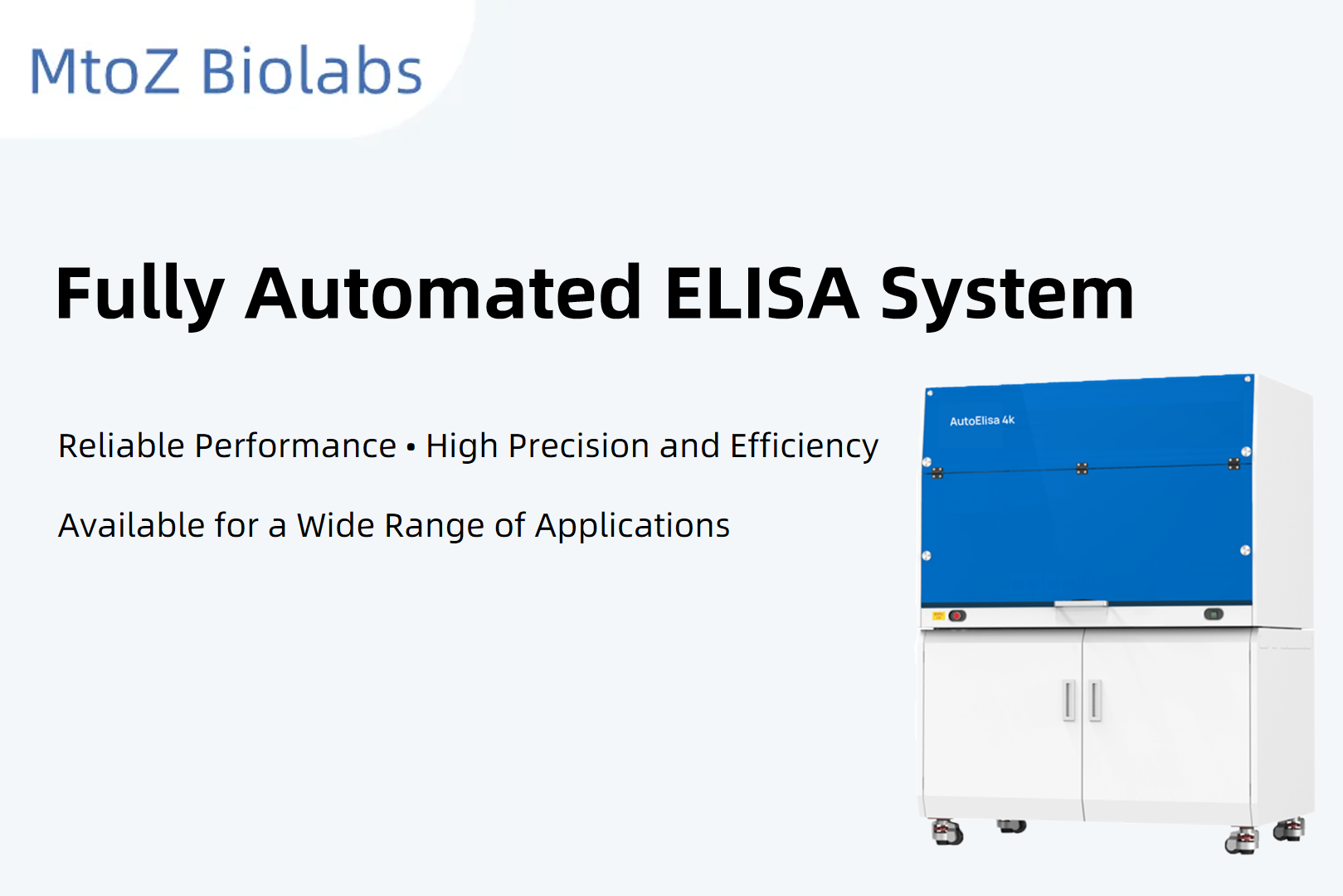 MtoZ Biolabs' Fully Automated ELISA System is a closed, integrated platform that automates standard curve dilution, dispensing, incubation, washing, color development, and plate reading for routine ELISA testing in biopharmaceutical quality control and research workflows.